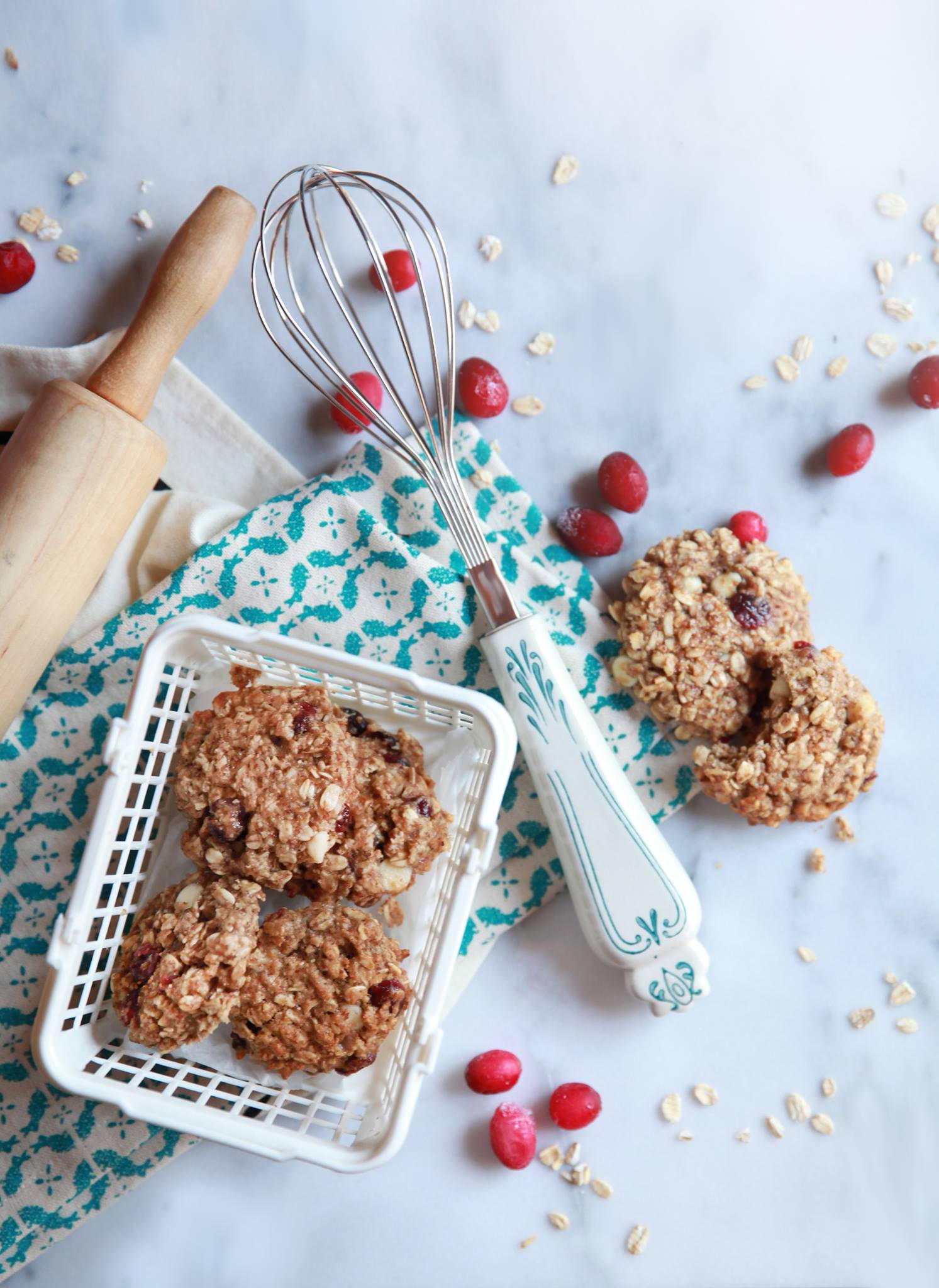 Flocons d'avoine mélangés (gros flocons d'avoine°, flocons d'avoine à cuisson rapide°), Sucres [miel°, compote de pommes non sucrée (pommes, eau, acide ascorbique)°], Farine d'avoine°, Canneberges séchées (canneberges, sucre, huile de tournesol)°, Oeufs°, Brisures de chocolat blanc bio (beurre de cacao biologique, sucre de canne biologique, amidon de tapioca biologique, extrait sec de sirop de riz biologique, maltodextrine de riz biologique, vanille biologique), Huile de canola, Bicarbonate de soude, Poudre à pâte, Sel de mer, Extrait de vanille°. Contient : Avoine, Oeufs. Peut contenir : Blé, Lait, Soya, Sésame.