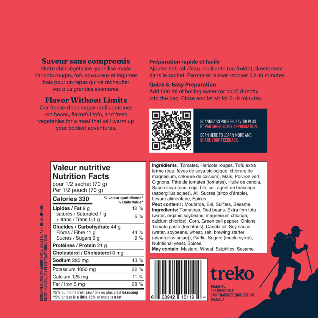 Les Cretons d’expé véganes Treko sont une réinterprétation innovante du traditionnel creton québécois. Grâce à une combinaison de lentilles rouges, d’avoine et d’épices soigneusement sélectionnées, ces cretons offrent une saveur authentique et une texture surprenante, tout en étant entièrement végétaliens. Lyophilisés à 100 %, ils sont légers, pratiques et prêts en un instant.