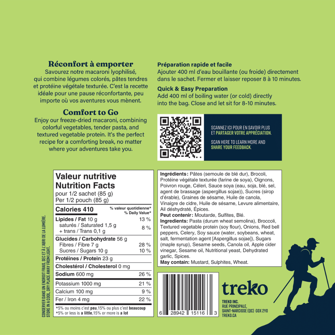 Ingrédients : Pâtes, Brocoli, Protéine végétale texturée, Oignons, Poivron rouge, Céleri, Sauce soya, Sirop d’érable, Graines de sésame, Huile de canola, Vinaigre de cidre, Huile de sésame, Levure alimentaire, Ail déshydraté, Épices. Contient : Soya. Peut contenir : Moutarde, Blé, Sulfites.